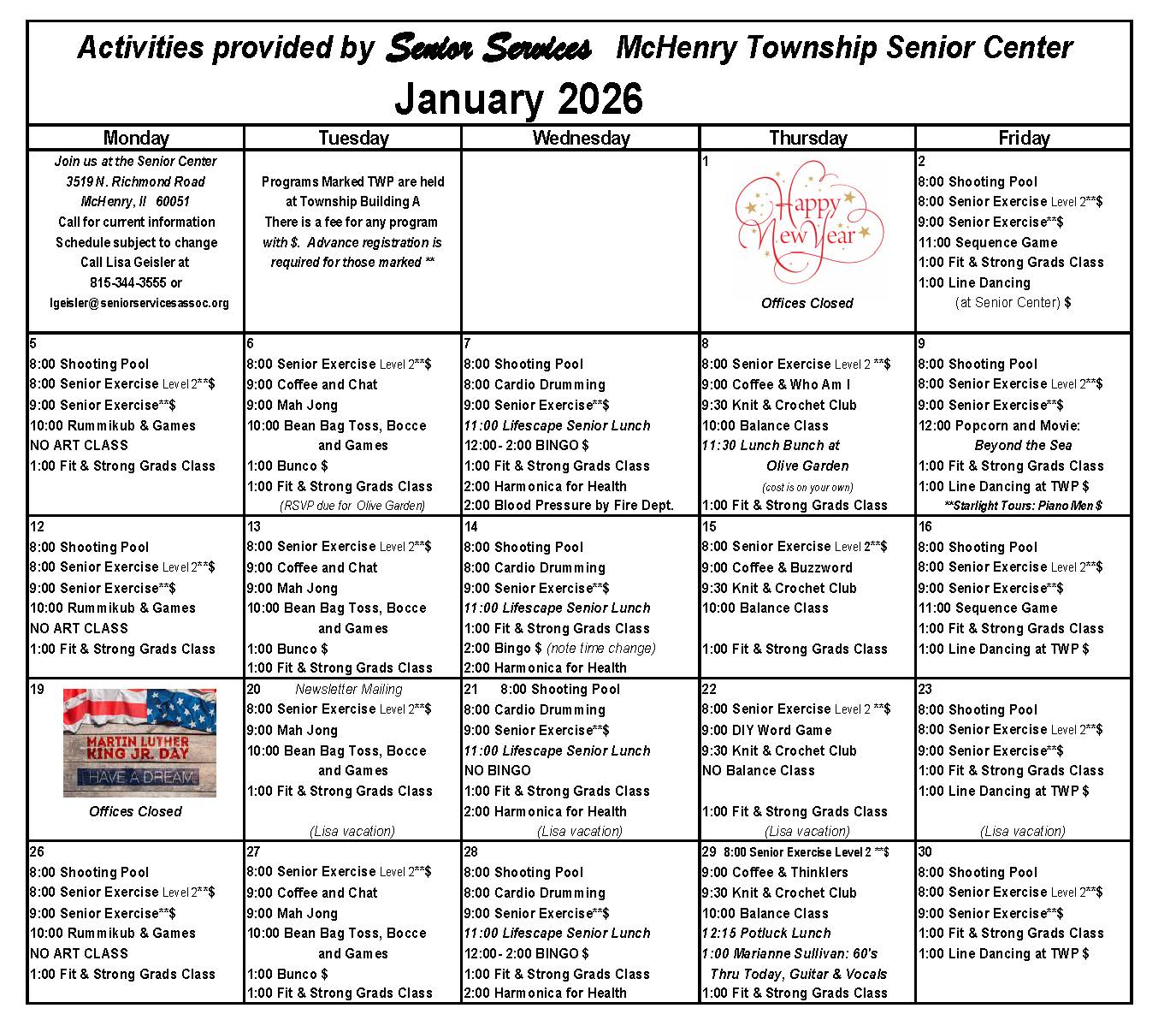 Discover the accessibility and friendliness that the senior center provides its residents. McHenry Township offers its older residents a wide variety of programs and services including transportation, events, exercise and recreational activities, and a variety of educational events, workshops and classes.